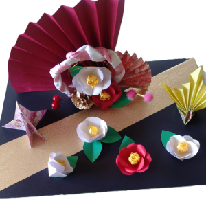 手作りの扇と祝い鶴、椿の花で皆さまをお迎えしました